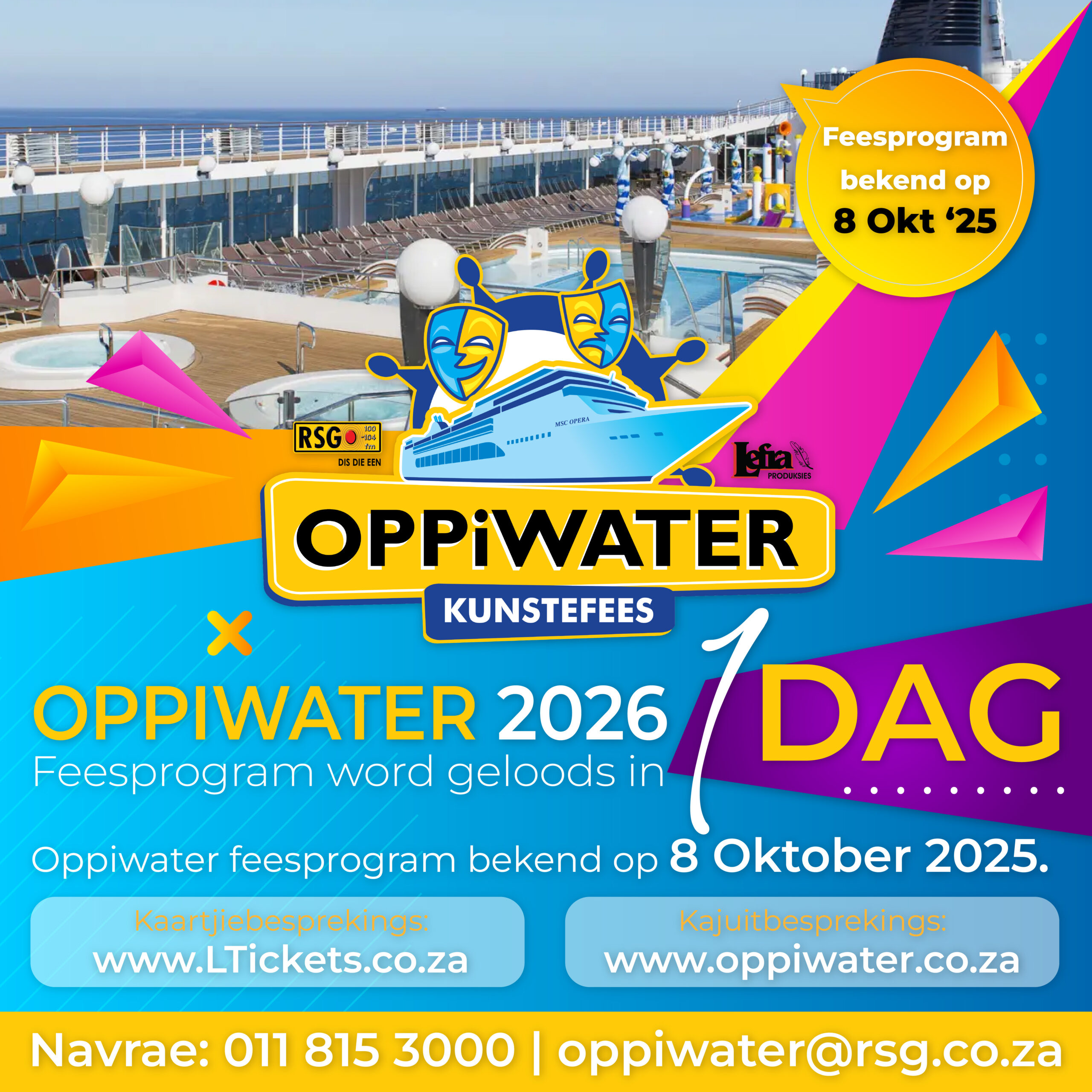Die Oppiwater Kunstefees program sal op 8 Oktober 2025 bekend gemaak word. Daarna kan u, u feeskaartjies bespreek by www.Ltickets.co.za